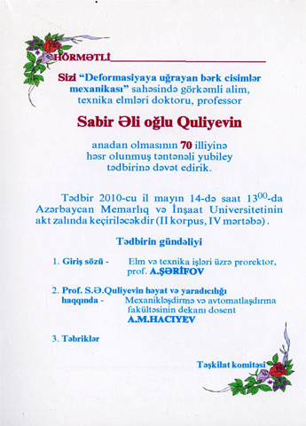 P.S. Azəbaycan respublikasında Elastiklik nəzəriyyəsi sahəsində(deformasiyaya uğrayan bərk cisimlər mexanikası, nəzəri mexanika, materiallar müqaviməti, inşaat mexanikası, qrunt mexanikası və i. a) çalışan həmkarlarımən xətirinə dəyməsin, məgər onların beynəlxalq mötəbər elm jurnallarında (yəni SCİ-indeksinə malik jurnallarda) mənimli qədər elmi məqalləri varmı, və mənə qarşı olan yad, biganə, namərd münasibətə qoy özləri qiymət versin.